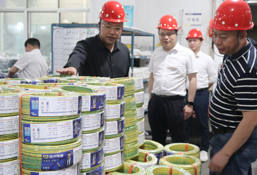 4月20日下午,應急管理部四川消防研究所國家防火建筑材料質(zhì)量檢驗檢測中心主任張翔、部長馮軍,東莞市質(zhì)量監(jiān)督檢測中心主任姚志慧等領導專家一行來到民興電纜,通過座談交流、走訪參觀等形式開展調(diào)研指導工作,民興電纜常務副總經(jīng)理張隆放攜管理團隊陪同調(diào)研。