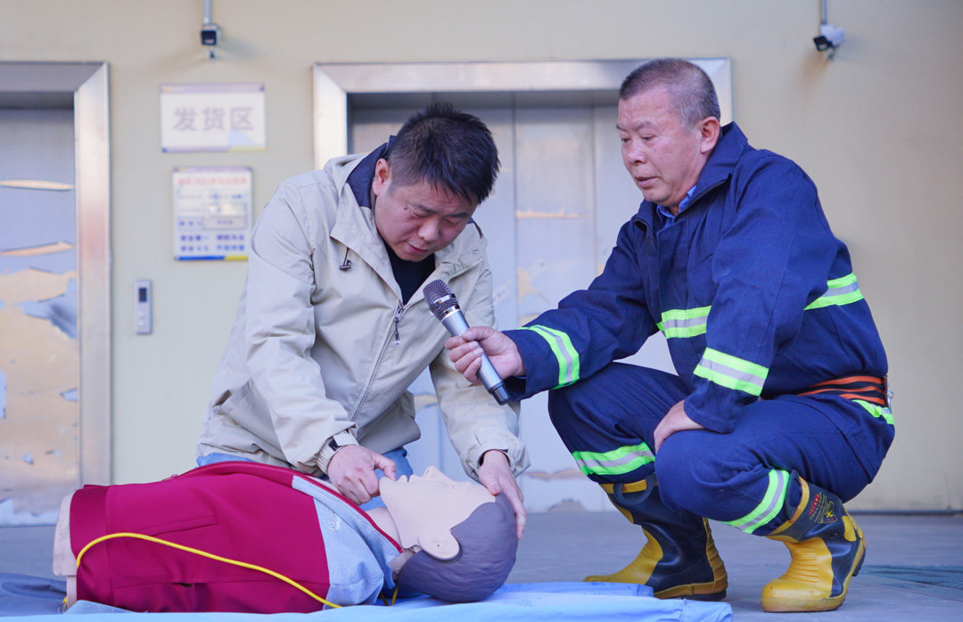 隨后,安全主任李義安為大家全面講解、展示了心肺復(fù)蘇的急救方法和步驟,并在他的耐心講解和指導(dǎo)下,各部門員工代表有條不紊地上臺模擬學(xué)習(xí)體驗。