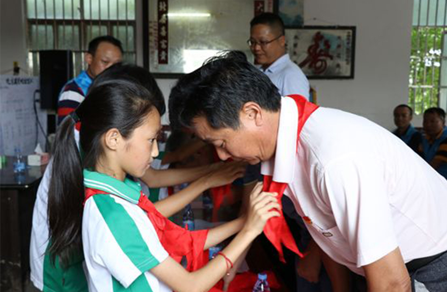 困難學(xué)生為出席捐贈(zèng)儀式的領(lǐng)導(dǎo)與愛心企業(yè)獻(xiàn)上紅領(lǐng)巾